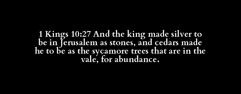 1 Kings 10:27 And the king made silver to be in Jerusalem as stones, and cedars made he to be as the sycamore trees that are in the vale, for abundance.