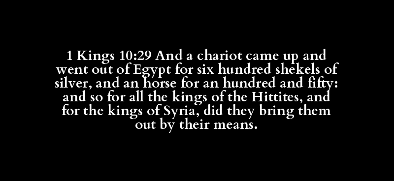 1 Kings 10:29 And a chariot came up and went out of Egypt for six hundred shekels of silver, and an horse for an hundred and fifty: and so for all the kings of the Hittites, and for the kings of Syria, did they bring them out by their means.