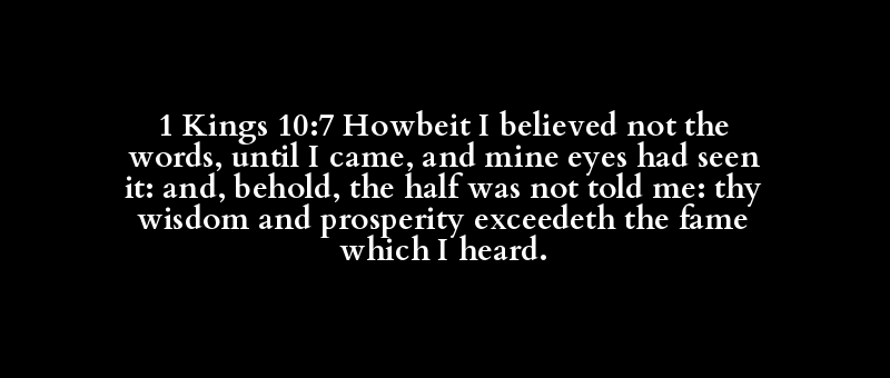 1 Kings 10:7 Howbeit I believed not the words, until I came, and mine eyes had seen it: and, behold, the half was not told me: thy wisdom and prosperity exceedeth the fame which I heard.