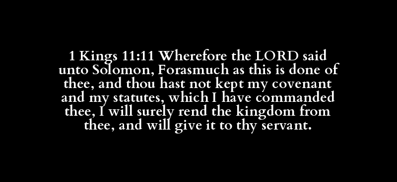 1 Kings 11:11 Wherefore the LORD said unto Solomon, Forasmuch as this is done of thee, and thou hast not kept my covenant and my statutes, which I have commanded thee, I will surely rend the kingdom from thee, and will give it to thy servant.