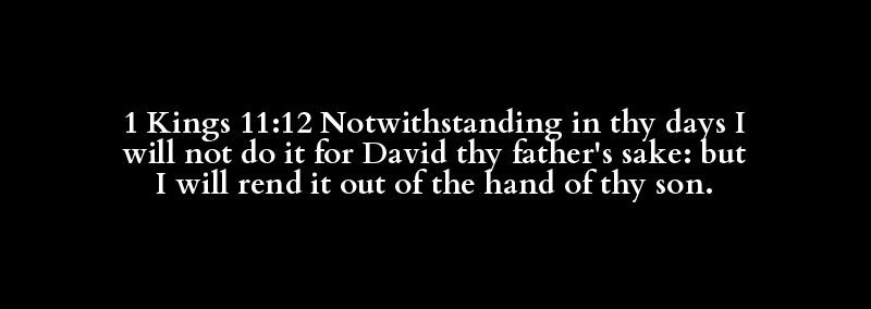 1 Kings 11:12 Notwithstanding in thy days I will not do it for David thy father's sake: but I will rend it out of the hand of thy son.