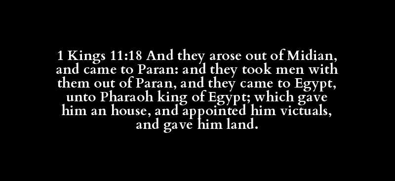 1 Kings 11:18 And they arose out of Midian, and came to Paran: and they took men with them out of Paran, and they came to Egypt, unto Pharaoh king of Egypt; which gave him an house, and appointed him victuals, and gave him land.