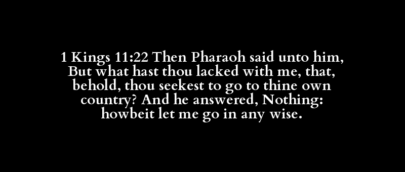 1 Kings 11:22 Then Pharaoh said unto him, But what hast thou lacked with me, that, behold, thou seekest to go to thine own country? And he answered, Nothing: howbeit let me go in any wise.