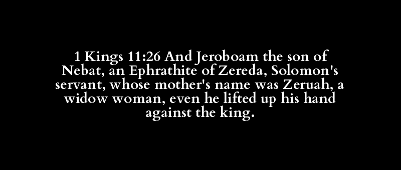 1 Kings 11:26 And Jeroboam the son of Nebat, an Ephrathite of Zereda, Solomon's servant, whose mother's name was Zeruah, a widow woman, even he lifted up his hand against the king.