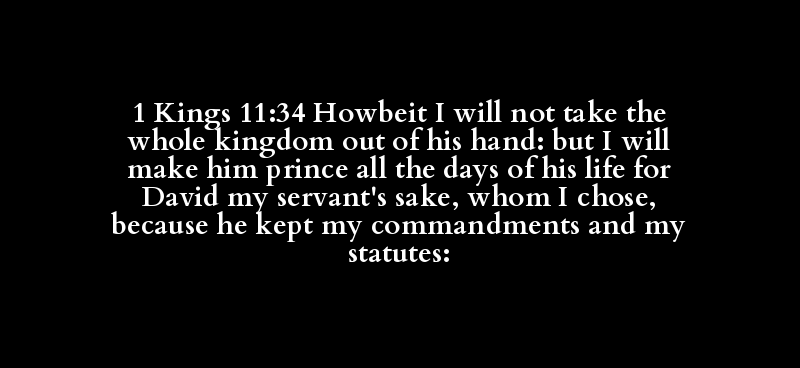 1 Kings 11:34 Howbeit I will not take the whole kingdom out of his hand: but I will make him prince all the days of his life for David my servant's sake, whom I chose, because he kept my commandments and my statutes: