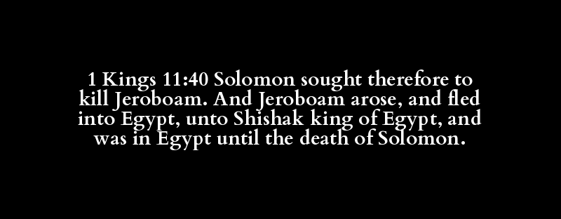 1 Kings 11:40 Solomon sought therefore to kill Jeroboam. And Jeroboam arose, and fled into Egypt, unto Shishak king of Egypt, and was in Egypt until the death of Solomon.