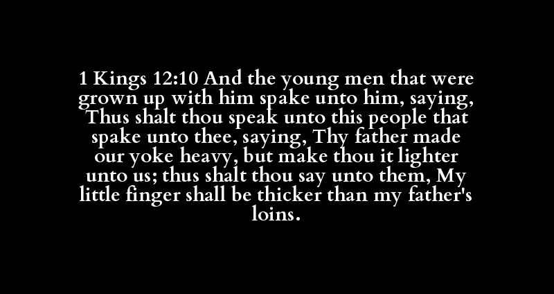 1 Kings 12:10 And the young men that were grown up with him spake unto him, saying, Thus shalt thou speak unto this people that spake unto thee, saying, Thy father made our yoke heavy, but make thou it lighter unto us; thus shalt thou say unto them, My little finger shall be thicker than my father's loins.