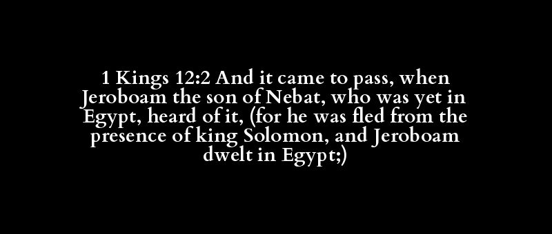 1 Kings 12:2 And it came to pass, when Jeroboam the son of Nebat, who was yet in Egypt, heard of it, (for he was fled from the presence of king Solomon, and Jeroboam dwelt in Egypt;)