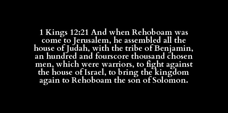 1 Kings 12:21 And when Rehoboam was come to Jerusalem, he assembled all the house of Judah, with the tribe of Benjamin, an hundred and fourscore thousand chosen men, which were warriors, to fight against the house of Israel, to bring the kingdom again to Rehoboam the son of Solomon.
