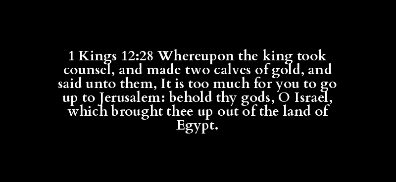 1 Kings 12:28 Whereupon the king took counsel, and made two calves of gold, and said unto them, It is too much for you to go up to Jerusalem: behold thy gods, O Israel, which brought thee up out of the land of Egypt.