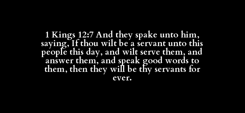 1 Kings 12:7 And they spake unto him, saying, If thou wilt be a servant unto this people this day, and wilt serve them, and answer them, and speak good words to them, then they will be thy servants for ever.