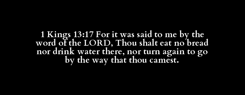 1 Kings 13:17 For it was said to me by the word of the LORD, Thou shalt eat no bread nor drink water there, nor turn again to go by the way that thou camest.