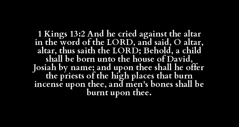 1 Kings 13:2 And he cried against the altar in the word of the LORD, and said, O altar, altar, thus saith the LORD; Behold, a child shall be born unto the house of David, Josiah by name; and upon thee shall he offer the priests of the high places that burn incense upon thee, and men's bones shall be burnt upon thee.