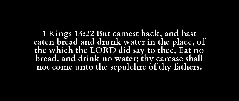 1 Kings 13:22 But camest back, and hast eaten bread and drunk water in the place, of the which the LORD did say to thee, Eat no bread, and drink no water; thy carcase shall not come unto the sepulchre of thy fathers.