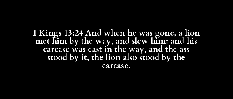 1 Kings 13:24 And when he was gone, a lion met him by the way, and slew him: and his carcase was cast in the way, and the ass stood by it, the lion also stood by the carcase.