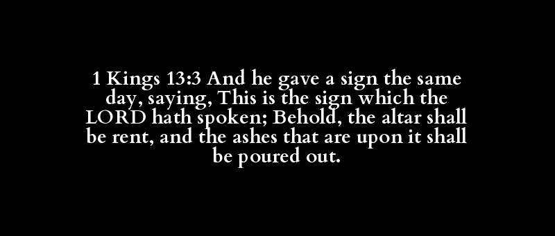 1 Kings 13:3 And he gave a sign the same day, saying, This is the sign which the LORD hath spoken; Behold, the altar shall be rent, and the ashes that are upon it shall be poured out.