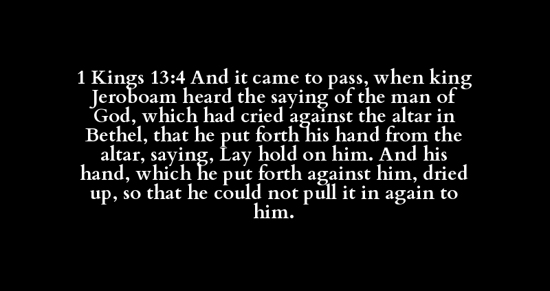1 Kings 13:4 And it came to pass, when king Jeroboam heard the saying of the man of God, which had cried against the altar in Bethel, that he put forth his hand from the altar, saying, Lay hold on him. And his hand, which he put forth against him, dried up, so that he could not pull it in again to him.