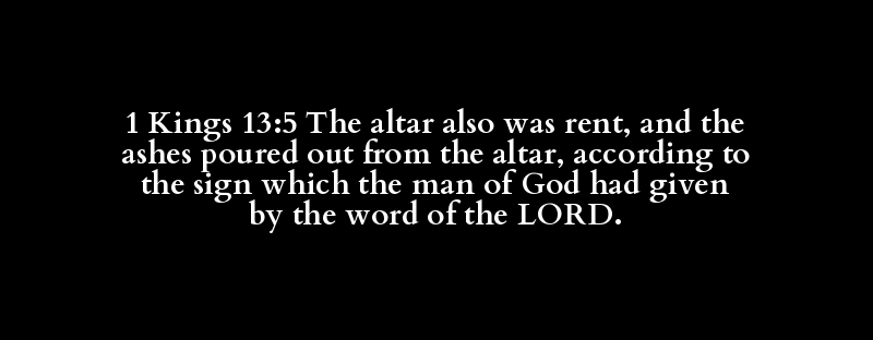 1 Kings 13:5 The altar also was rent, and the ashes poured out from the altar, according to the sign which the man of God had given by the word of the LORD.