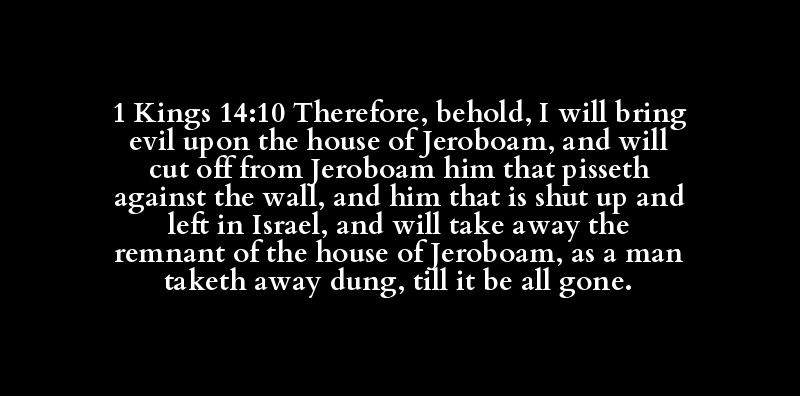 1 Kings 14:10 Therefore, behold, I will bring evil upon the house of Jeroboam, and will cut off from Jeroboam him that pisseth against the wall, and him that is shut up and left in Israel, and will take away the remnant of the house of Jeroboam, as a man taketh away dung, till it be all gone.