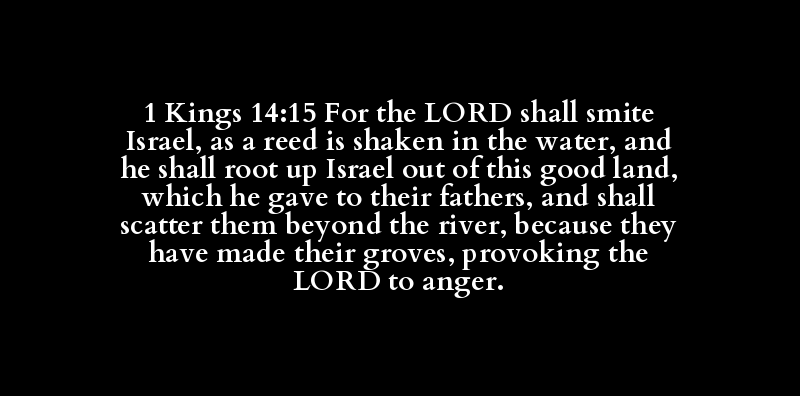 1 Kings 14:15 For the LORD shall smite Israel, as a reed is shaken in the water, and he shall root up Israel out of this good land, which he gave to their fathers, and shall scatter them beyond the river, because they have made their groves, provoking the LORD to anger.