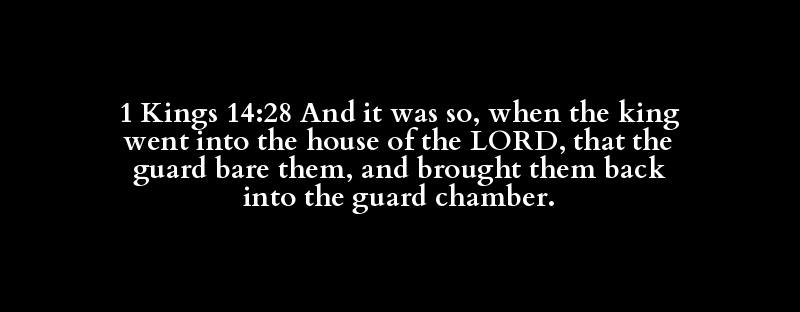 1 Kings 14:28 And it was so, when the king went into the house of the LORD, that the guard bare them, and brought them back into the guard chamber.