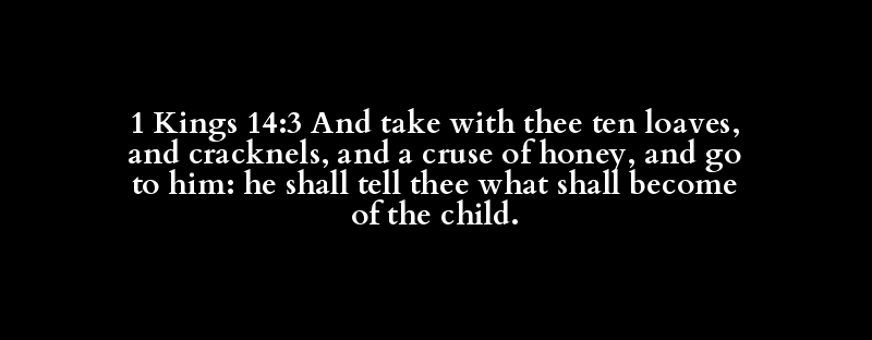 1 Kings 14:3 And take with thee ten loaves, and cracknels, and a cruse of honey, and go to him: he shall tell thee what shall become of the child.