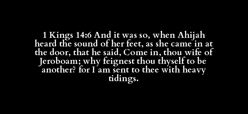 1 Kings 14:6 And it was so, when Ahijah heard the sound of her feet, as she came in at the door, that he said, Come in, thou wife of Jeroboam; why feignest thou thyself to be another? for I am sent to thee with heavy tidings.