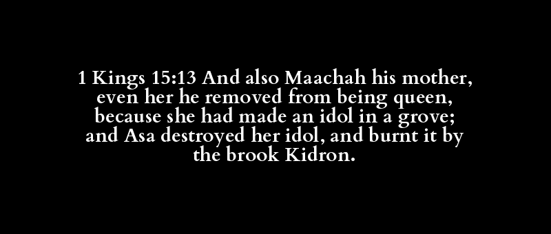 1 Kings 15:13 And also Maachah his mother, even her he removed from being queen, because she had made an idol in a grove; and Asa destroyed her idol, and burnt it by the brook Kidron.