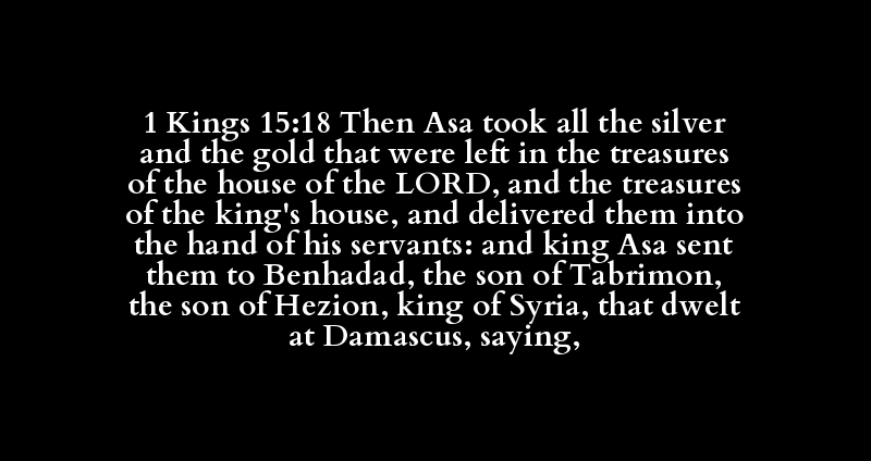 1 Kings 15:18 Then Asa took all the silver and the gold that were left in the treasures of the house of the LORD, and the treasures of the king's house, and delivered them into the hand of his servants: and king Asa sent them to Benhadad, the son of Tabrimon, the son of Hezion, king of Syria, that dwelt at Damascus, saying,
