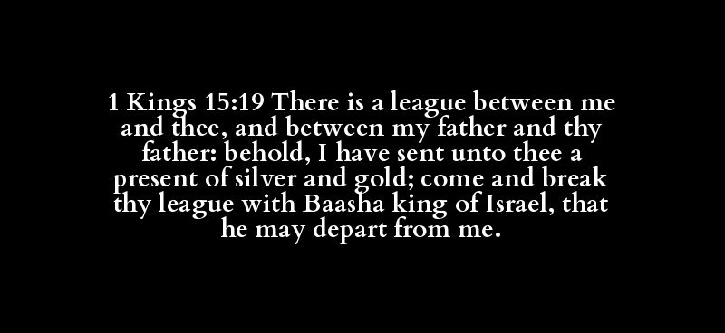 1 Kings 15:19 There is a league between me and thee, and between my father and thy father: behold, I have sent unto thee a present of silver and gold; come and break thy league with Baasha king of Israel, that he may depart from me.