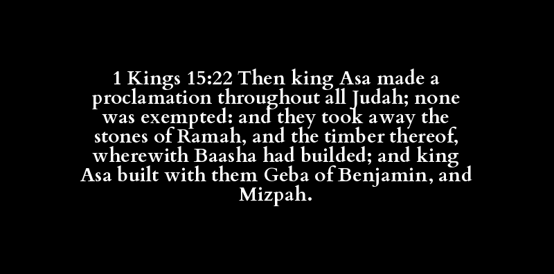 1 Kings 15:22 Then king Asa made a proclamation throughout all Judah; none was exempted: and they took away the stones of Ramah, and the timber thereof, wherewith Baasha had builded; and king Asa built with them Geba of Benjamin, and Mizpah.