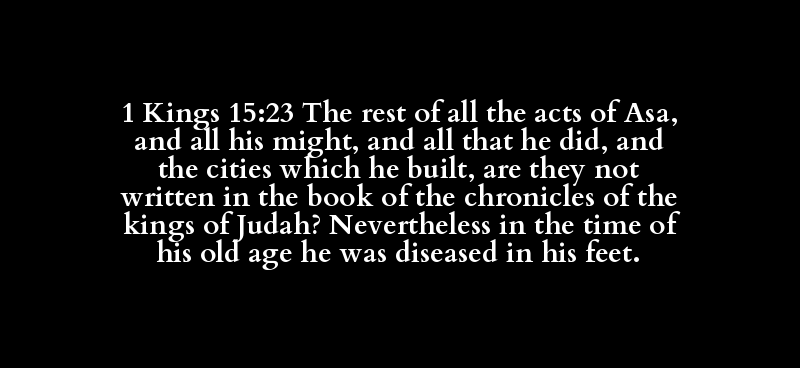 1 Kings 15:23 The rest of all the acts of Asa, and all his might, and all that he did, and the cities which he built, are they not written in the book of the chronicles of the kings of Judah? Nevertheless in the time of his old age he was diseased in his feet.