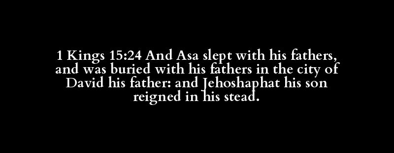 1 Kings 15:24 And Asa slept with his fathers, and was buried with his fathers in the city of David his father: and Jehoshaphat his son reigned in his stead.