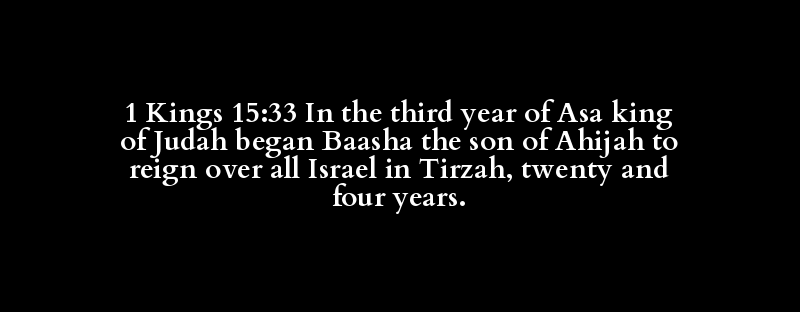 1 Kings 15:33 In the third year of Asa king of Judah began Baasha the son of Ahijah to reign over all Israel in Tirzah, twenty and four years.
