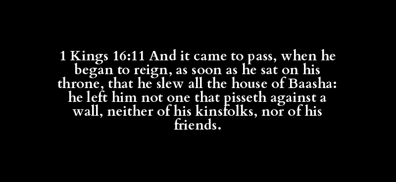 1 Kings 16:11 And it came to pass, when he began to reign, as soon as he sat on his throne, that he slew all the house of Baasha: he left him not one that pisseth against a wall, neither of his kinsfolks, nor of his friends.