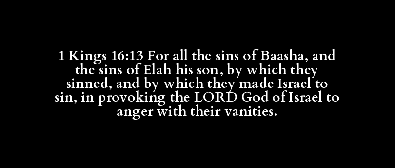 1 Kings 16:13 For all the sins of Baasha, and the sins of Elah his son, by which they sinned, and by which they made Israel to sin, in provoking the LORD God of Israel to anger with their vanities.