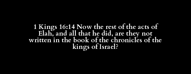 1 Kings 16:14 Now the rest of the acts of Elah, and all that he did, are they not written in the book of the chronicles of the kings of Israel?