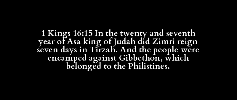 1 Kings 16:15 In the twenty and seventh year of Asa king of Judah did Zimri reign seven days in Tirzah. And the people were encamped against Gibbethon, which belonged to the Philistines.