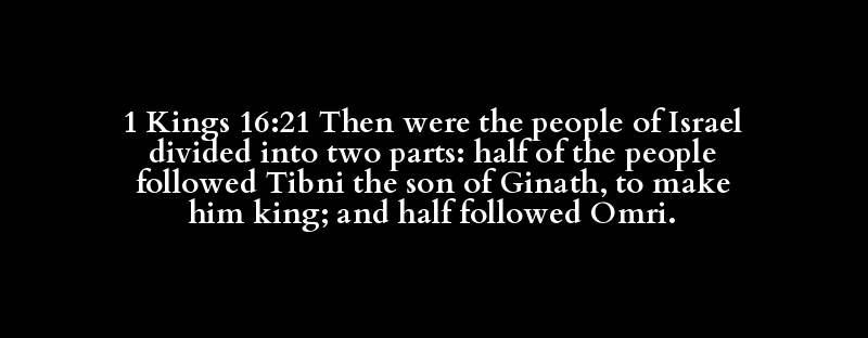 1 Kings 16:21 Then were the people of Israel divided into two parts: half of the people followed Tibni the son of Ginath, to make him king; and half followed Omri.