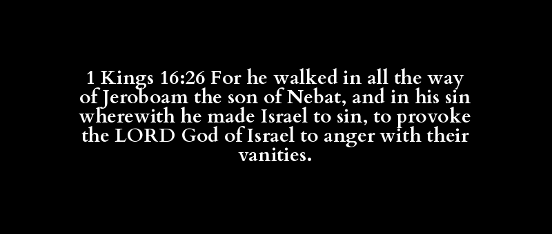 1 Kings 16:26 For he walked in all the way of Jeroboam the son of Nebat, and in his sin wherewith he made Israel to sin, to provoke the LORD God of Israel to anger with their vanities.