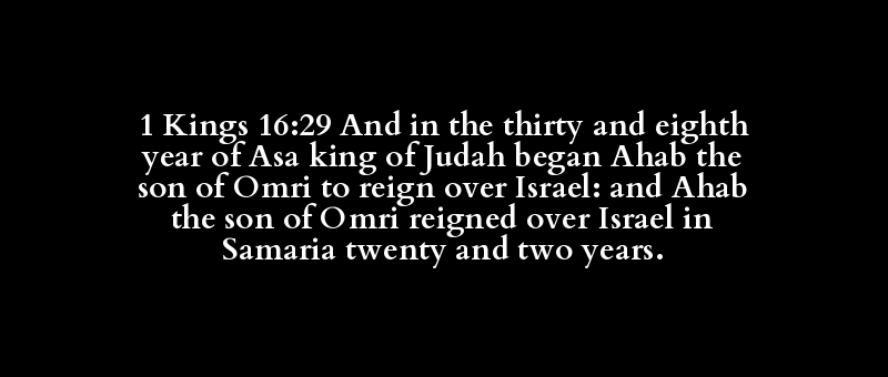 1 Kings 16:29 And in the thirty and eighth year of Asa king of Judah began Ahab the son of Omri to reign over Israel: and Ahab the son of Omri reigned over Israel in Samaria twenty and two years.