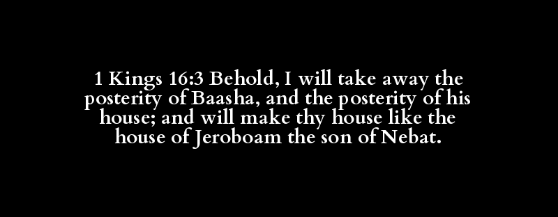 1 Kings 16:3 Behold, I will take away the posterity of Baasha, and the posterity of his house; and will make thy house like the house of Jeroboam the son of Nebat.