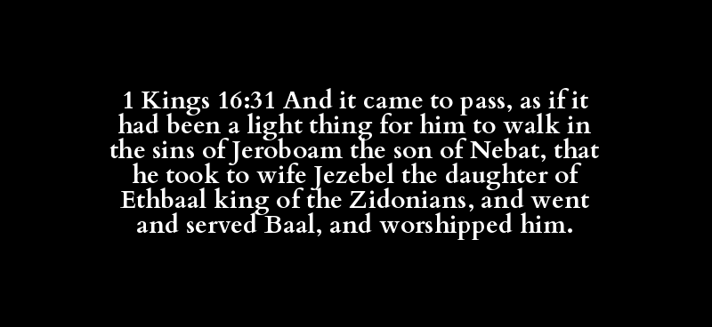 1 Kings 16:31 And it came to pass, as if it had been a light thing for him to walk in the sins of Jeroboam the son of Nebat, that he took to wife Jezebel the daughter of Ethbaal king of the Zidonians, and went and served Baal, and worshipped him.