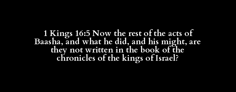 1 Kings 16:5 Now the rest of the acts of Baasha, and what he did, and his might, are they not written in the book of the chronicles of the kings of Israel?