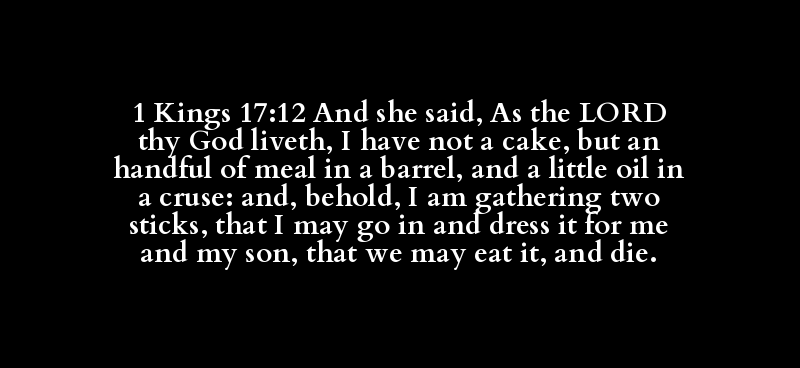 1 Kings 17:12 And she said, As the LORD thy God liveth, I have not a cake, but an handful of meal in a barrel, and a little oil in a cruse: and, behold, I am gathering two sticks, that I may go in and dress it for me and my son, that we may eat it, and die.