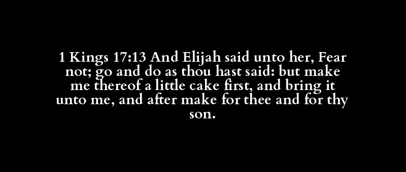 1 Kings 17:13 And Elijah said unto her, Fear not; go and do as thou hast said: but make me thereof a little cake first, and bring it unto me, and after make for thee and for thy son.