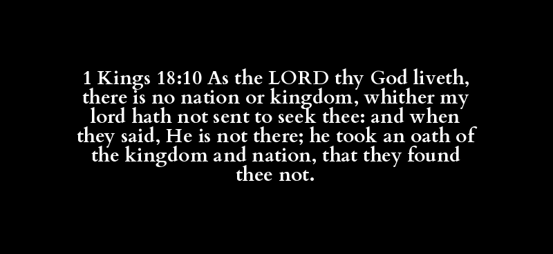 1 Kings 18:10 As the LORD thy God liveth, there is no nation or kingdom, whither my lord hath not sent to seek thee: and when they said, He is not there; he took an oath of the kingdom and nation, that they found thee not.