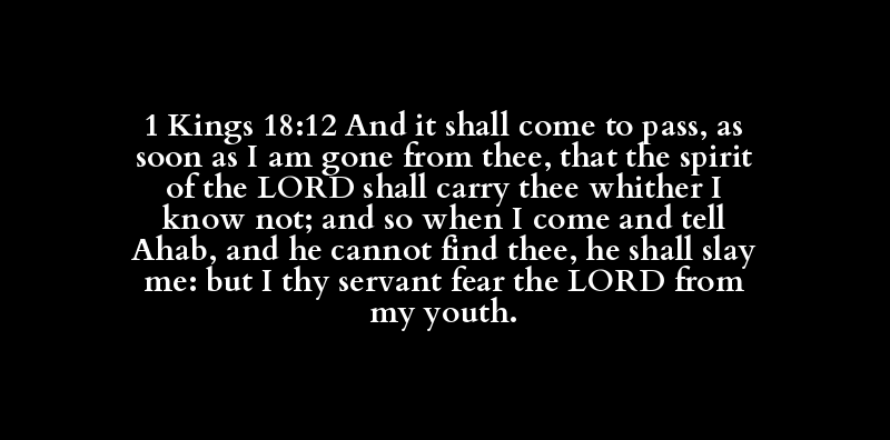 1 Kings 18:12 And it shall come to pass, as soon as I am gone from thee, that the spirit of the LORD shall carry thee whither I know not; and so when I come and tell Ahab, and he cannot find thee, he shall slay me: but I thy servant fear the LORD from my youth.