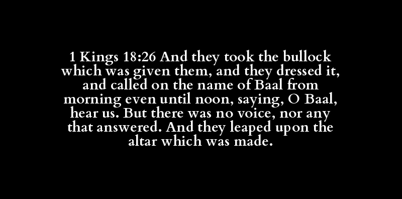 1 Kings 18:26 And they took the bullock which was given them, and they dressed it, and called on the name of Baal from morning even until noon, saying, O Baal, hear us. But there was no voice, nor any that answered. And they leaped upon the altar which was made.
