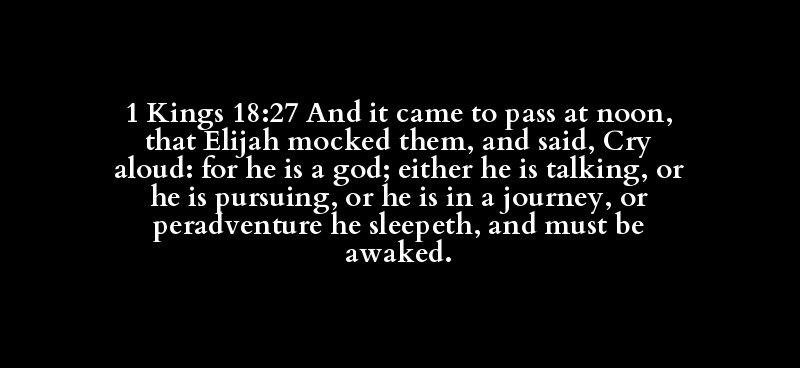 1 Kings 18:27 And it came to pass at noon, that Elijah mocked them, and said, Cry aloud: for he is a god; either he is talking, or he is pursuing, or he is in a journey, or peradventure he sleepeth, and must be awaked.